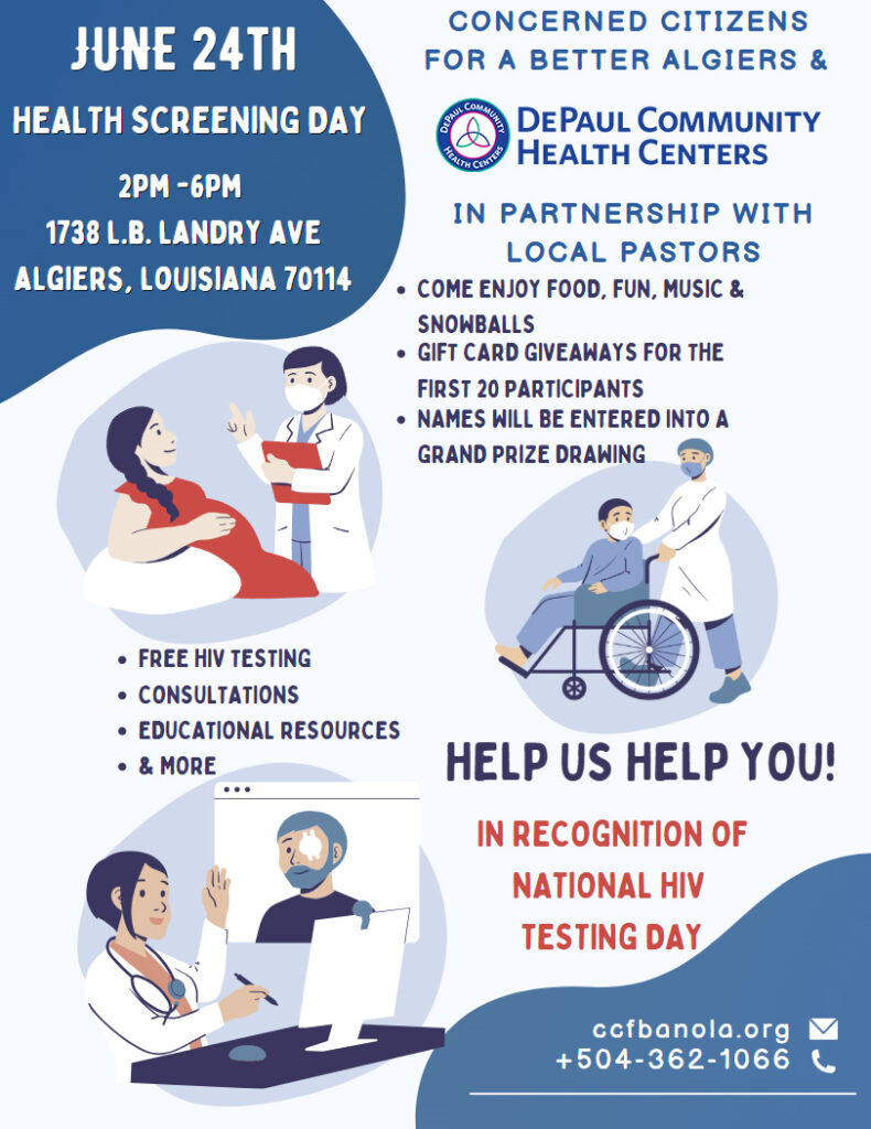 In recognition of National HIV Testing Day, join Concerned Citizens for a Better Algiers & DePaul Community Health Centers for a health screening event.