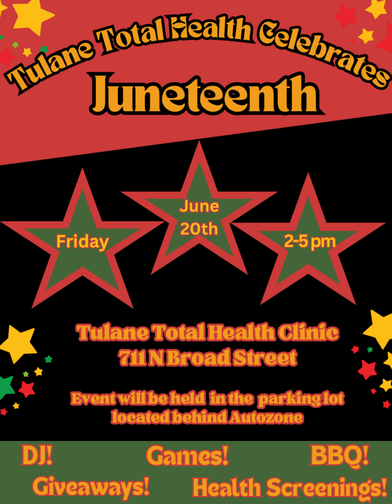 Join us as Tulane Total Health Clinic celebrates Juneteenth — a day of reflection, community, and joy. This event honors freedom and promotes wellness, equity, and connection through music, food, and essential health services. Please share this event with others.